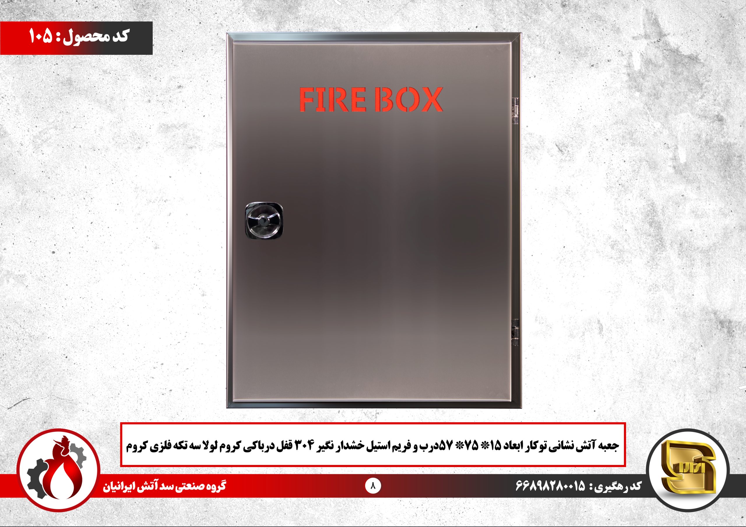 جعبه آتش نشانی توکار ابعاد 15*75*57 درب و فریم استیل خشدار نگیر 304 قفل درباکی کروم لولا سه تکه فلزی کروم