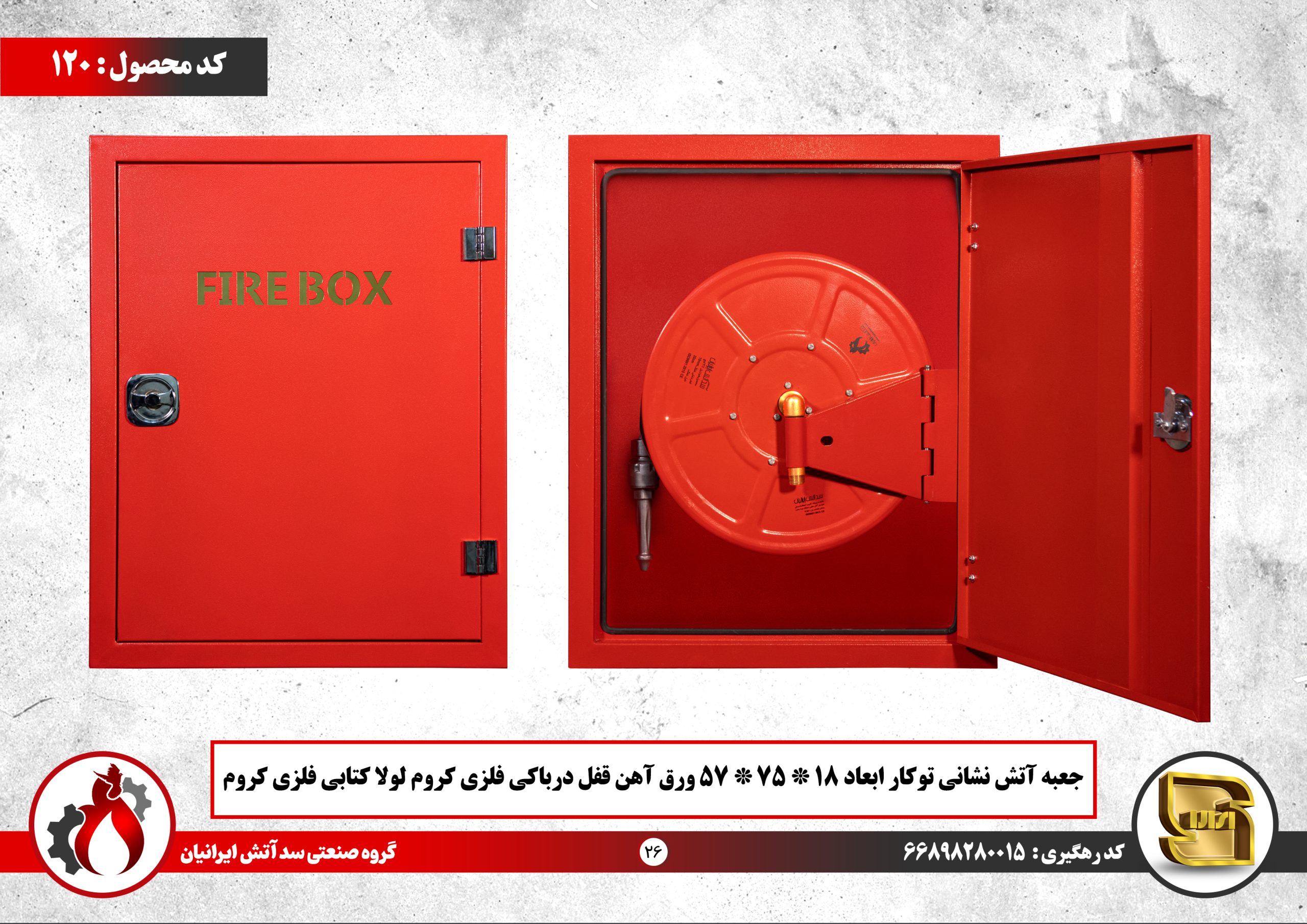 جعبه آتش نشانی توکار ابعاد 18*75*57 ورق آهن قفل درباکی فلزی کروم لولا کتابی فلزی کروم