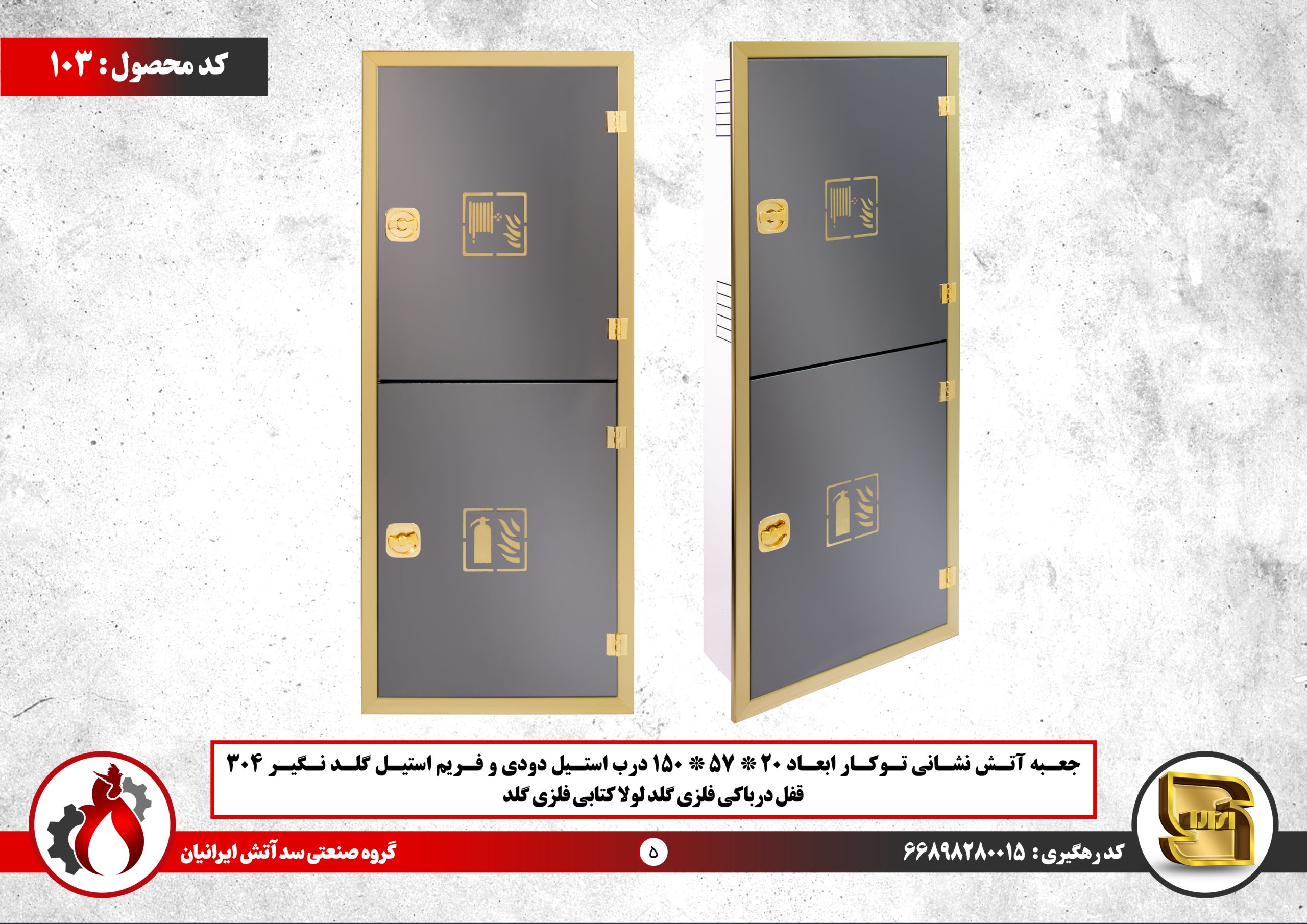 جعبه آتش نشانی توکار ابعاد 20*57*150 درب استیل دودی و فریم استیل گلد نگیر 304 قفل درباکی فلزی گلد لولا کتابی فلزی گلد
